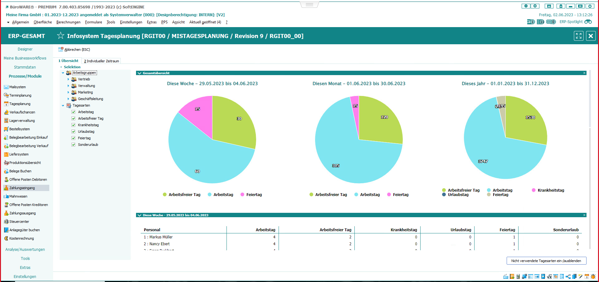 - Entdecken Sie im SoftENGINE CRM die neue Funktion zur Erstellung und Anzeige einer individuell definierten Statistik über die Verwendung bestimmter Tagesarten für ausgewählte Personallisten – direkt über das Extras-Menü.