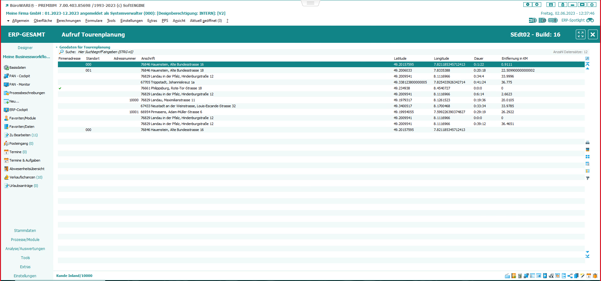 In der SoftENGINE ERP verwalten Sie all Ihre Kontakte, ob Kunden, Interessenten, Lieferanten, Filialen, Teams oder Mitarbeiter. Warum also sollte Sie die ERP nicht auch bei Reise-Routen oder bei der Ermittlung eines Team-Treffpunkt unterstützen? Stellen Sie sich einfach nach bestimmten Kriterien Adressen zusammen und planen Sie Touren mit wenigen Klicks.