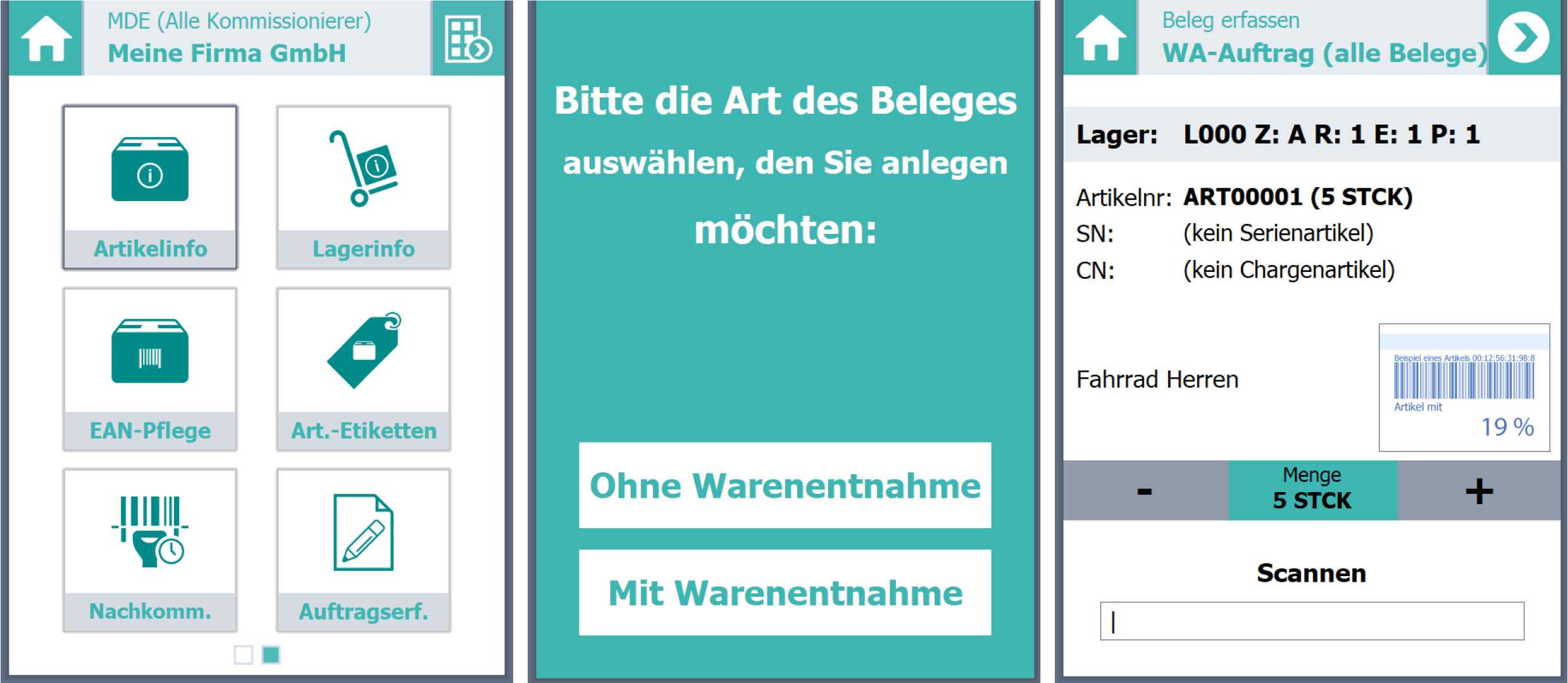 Desktop-PCs und Notebooks sind bei Lager-, Kommissionierungs– und Verpackungsarbeiten praktisch nicht einsetzbar. Das Modul MDE (Mobile Datenerfassung) stellt die an diesen Arbeitsplätzen benötigten Funktionen in einer speziell dafür entwickelten Oberfläche auf mobilen Geräten zur Verfügung.
