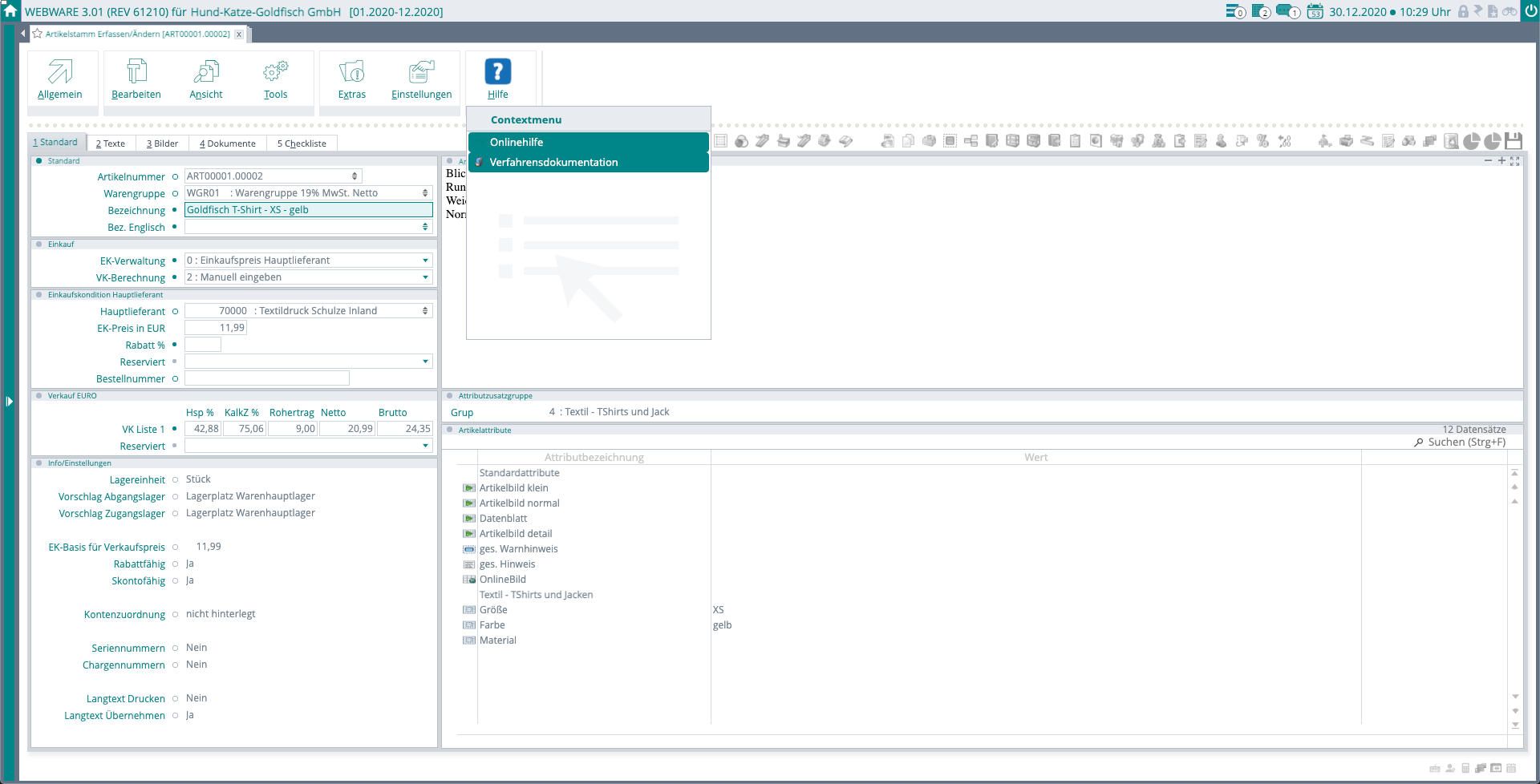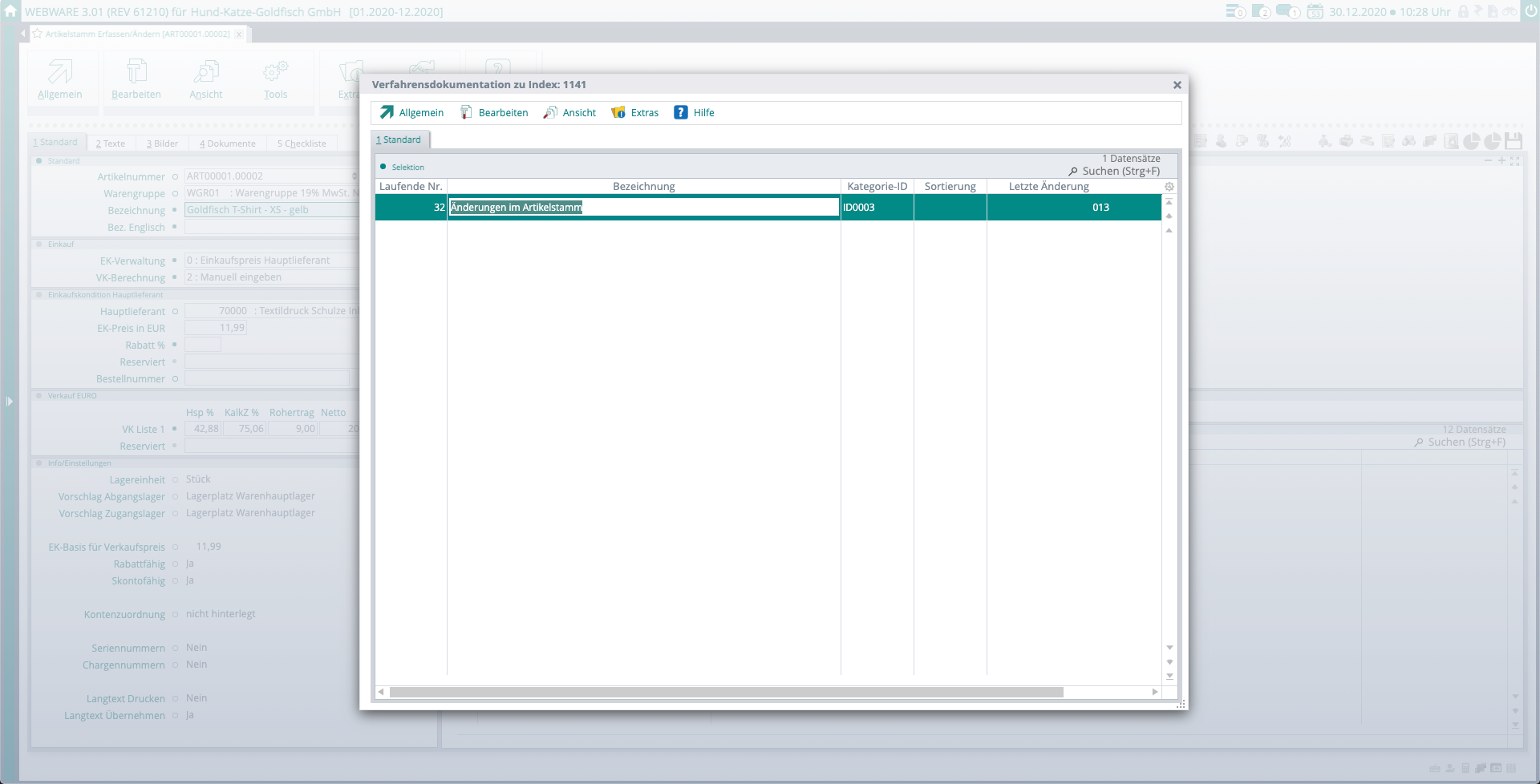 Mit den in der SoftENGINE ERP integrierten Funktionen kann bei regelmäßiger Pflege eine komplette Verfahrensdokumentation aufgebaut werden – im laufenden Betrieb und genau an den Stellen, an denen sie gebraucht wird. Das zusätzliche Einbeziehen der SoftENGINE Hilfe-Artikel im Wiki und der Software-Dokumentation stellt sicher, dass bei ein Prüfung alle benötigten Dokumente zur Verfügung stehen.