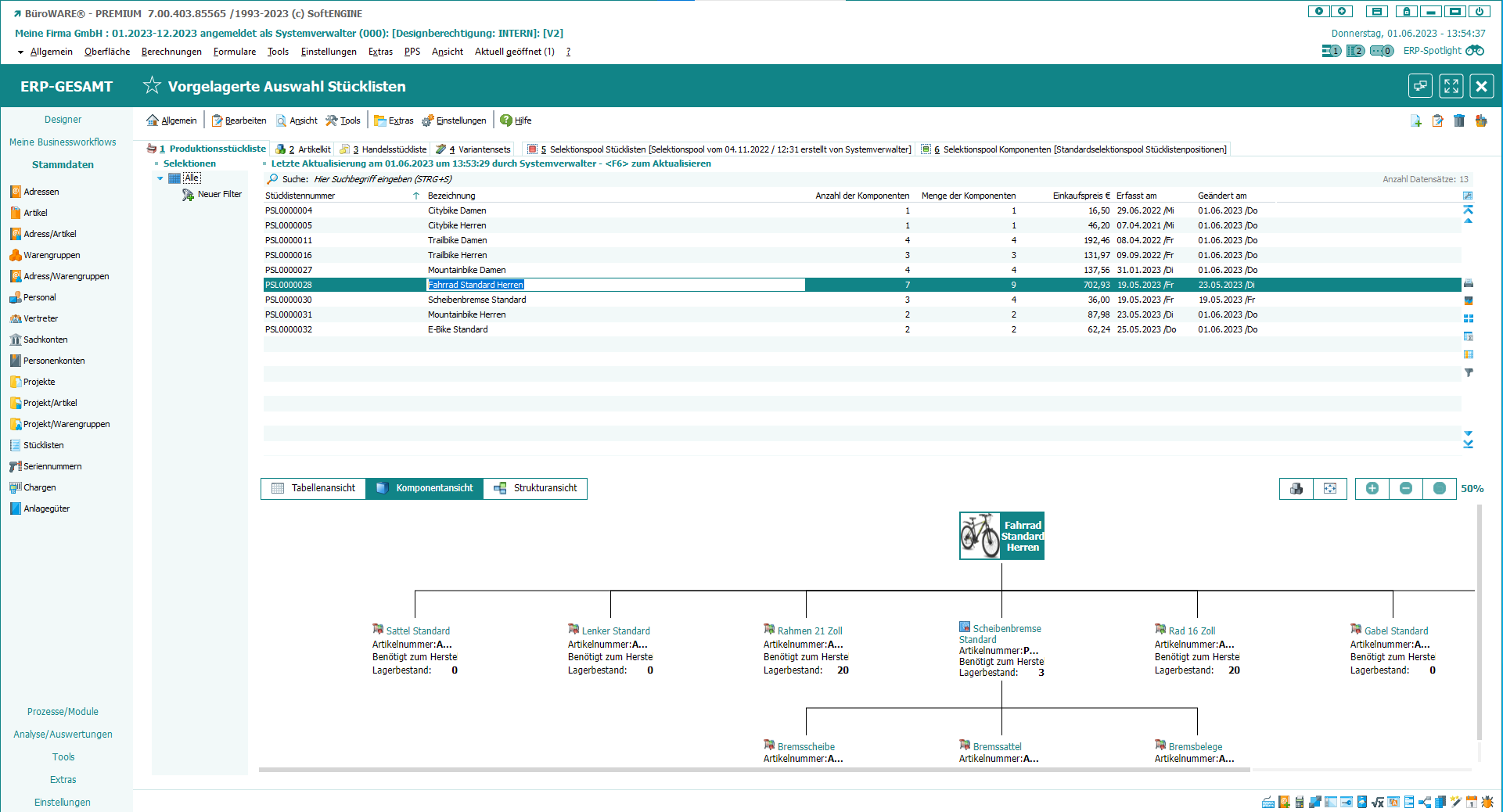 - Verschachtelung mehrerer Produktionsstücklisten: Es können nicht nur einzelne Bauteile sondern auch mehrere Produktionsstücklisten innerhalb “einer” Produktionsstückliste erfasst und “verschachtelt” werden.
